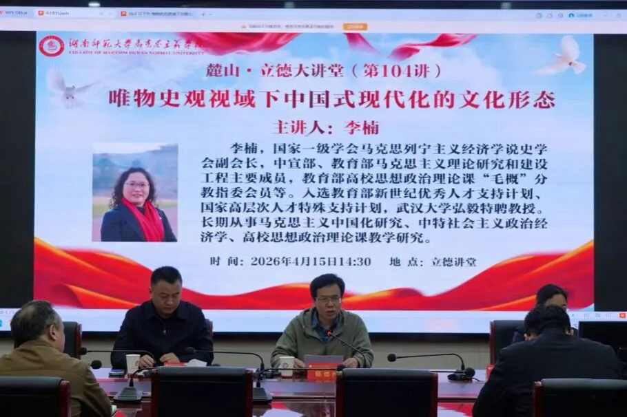 (通讯员 李欣 张馨月 欧阳娴)2026年4月15日下午,教育部高校思政课“毛概”分教指委委员、武汉大学威廉希尔中文网站平台博士生导师、弘毅特聘教授、二级教授李楠莅临威廉希尔中文网站平台开展了题为《唯物史观视域下中国式现代化的文化形态》的学术讲座。本次讲座由学院副院长陈德祥教授主持,学院师生积极参与。
